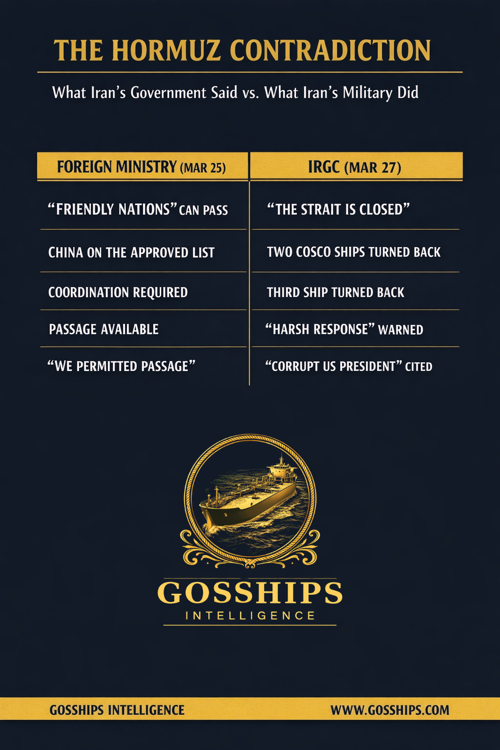 This creates an extraordinary situation. Iran’s foreign ministry, through FM Araghchi, announced on March 25 that Chinese ships have safe passage with coordination. Iran’s military, through the IRGC, turned back Chinese ships on March 27 and declared the Strait closed. It remains unclear whether COSCO completed the coordination process that Iran’s foreign ministry required as a condition of transit. Araghchi’s announcement specified that passage was available “in coordination with the competent Iranian authorities.” If COSCO attempted to transit without completing that process, the IRGC may have been enforcing the conditions rather than contradicting the foreign ministry. But the IRGC’s own statement did not cite a lack of coordination. It cited Trump’s claim that the Strait was open. The effect is the same: two branches of the same government issued signals that produced opposite outcomes within 48 hours.