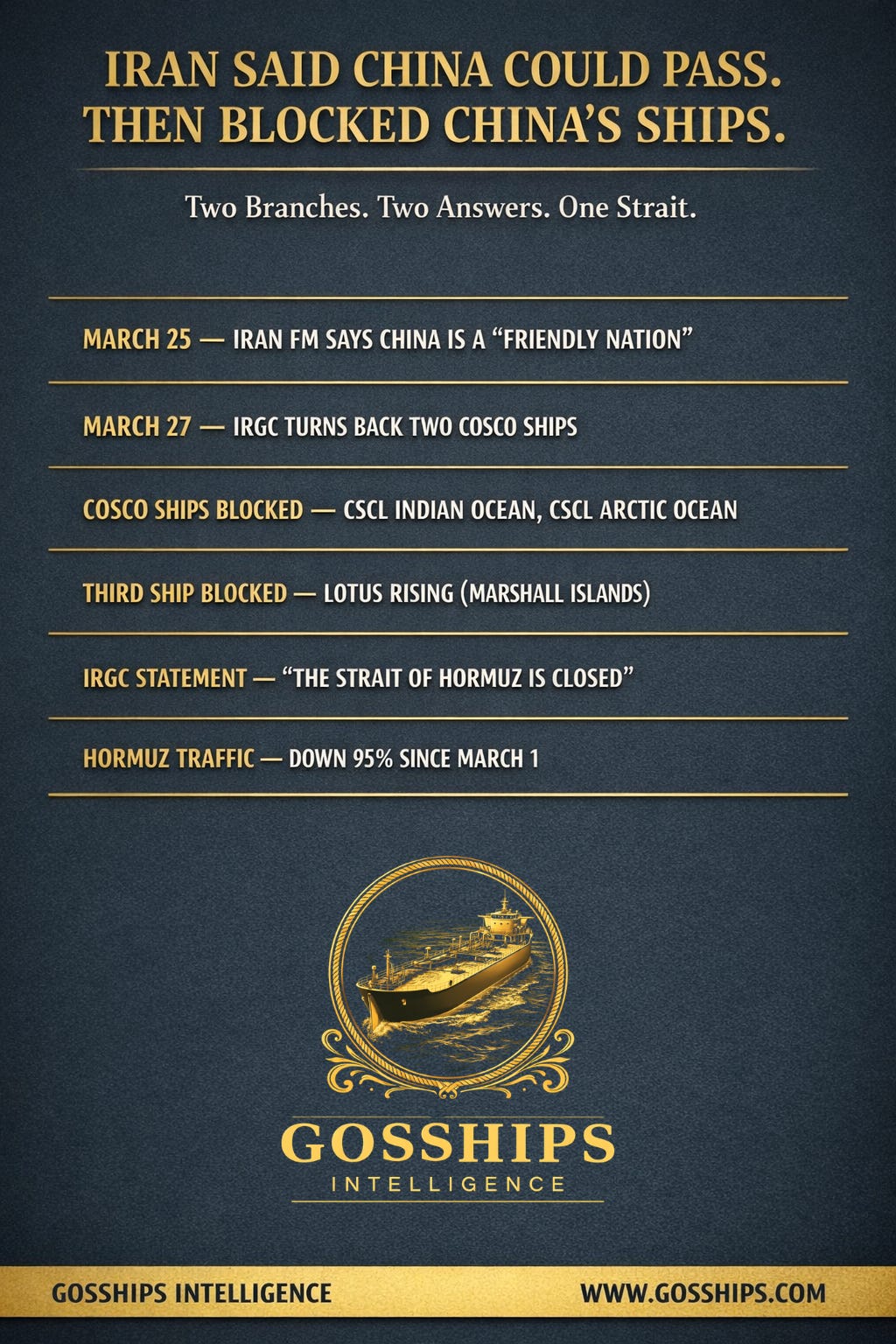 Iran’s Foreign Minister Abbas Araghchi announced on March 25 that China is a “friendly nation” with safe passage through the Strait of Hormuz, according to Reuters, Bloomberg, and Al Jazeera. Two days later, on March 27, Iran’s Islamic Revolutionary Guard Corps turned back two of China’s biggest container ships at the entrance to the Strait, according to Newsweek, the Foundation for Defense of Democracies, and MarineTraffic vessel tracking data. The CSCL Indian Ocean and the CSCL Arctic Ocean, both owned by China’s state-run COSCO Shipping, made U-turns near Larak Island at 3:20 AM and 3:50 AM UTC after being denied passage, according to MarineTraffic. The IRGC then declared the Strait of Hormuz “closed” and said any movement through it “will be met with a harsh response,” according to Newsweek and CBS News. Iran’s foreign ministry says friendly nations can pass with coordination. Iran’s military says nobody passes. It is unclear whether COSCO completed the coordination process Iran’s foreign ministry required before the ships attempted transit. Two branches of the same government gave two different signals on the same waterway within 48 hours. Gas in America went from $2.98 to $3.98 in 30 days.