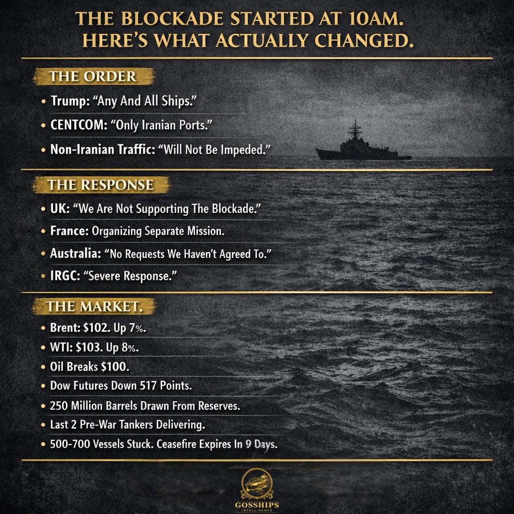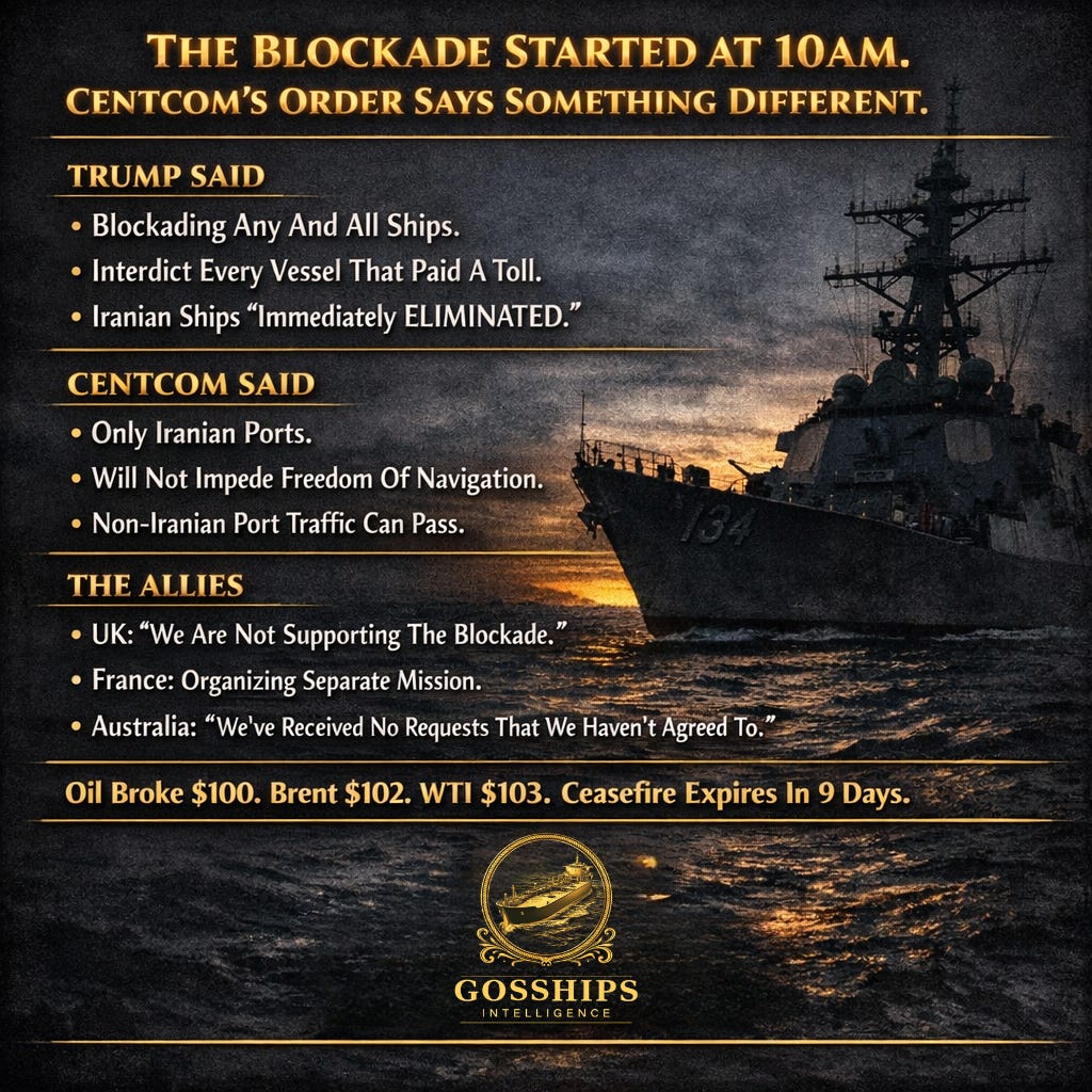 The US blockade of Iranian ports started at 10am Eastern Time this morning. But CENTCOM’s actual order is not what Trump announced. On Sunday, Trump posted on Truth Social that the US Navy would begin “BLOCKADING any and all Ships trying to enter, or leave, the Strait of Hormuz,” according to CBS News and CNBC. On Sunday night, CENTCOM issued a different statement. CENTCOM said the blockade would apply to “all maritime traffic entering and exiting Iranian ports” but that US forces “will not impede freedom of navigation for vessels transiting the Strait of Hormuz to and from non-Iranian ports,” according to CNBC, CNN, and Al Jazeera. That is a critical distinction. Trump’s version blockades the entire strait. CENTCOM’s version blockades Iran. For every shipowner with cargo bound for Saudi Arabia, the UAE, Kuwait, Qatar, or Iraq, the US military just said: you can pass. The problem is that Iran has not said the same thing.