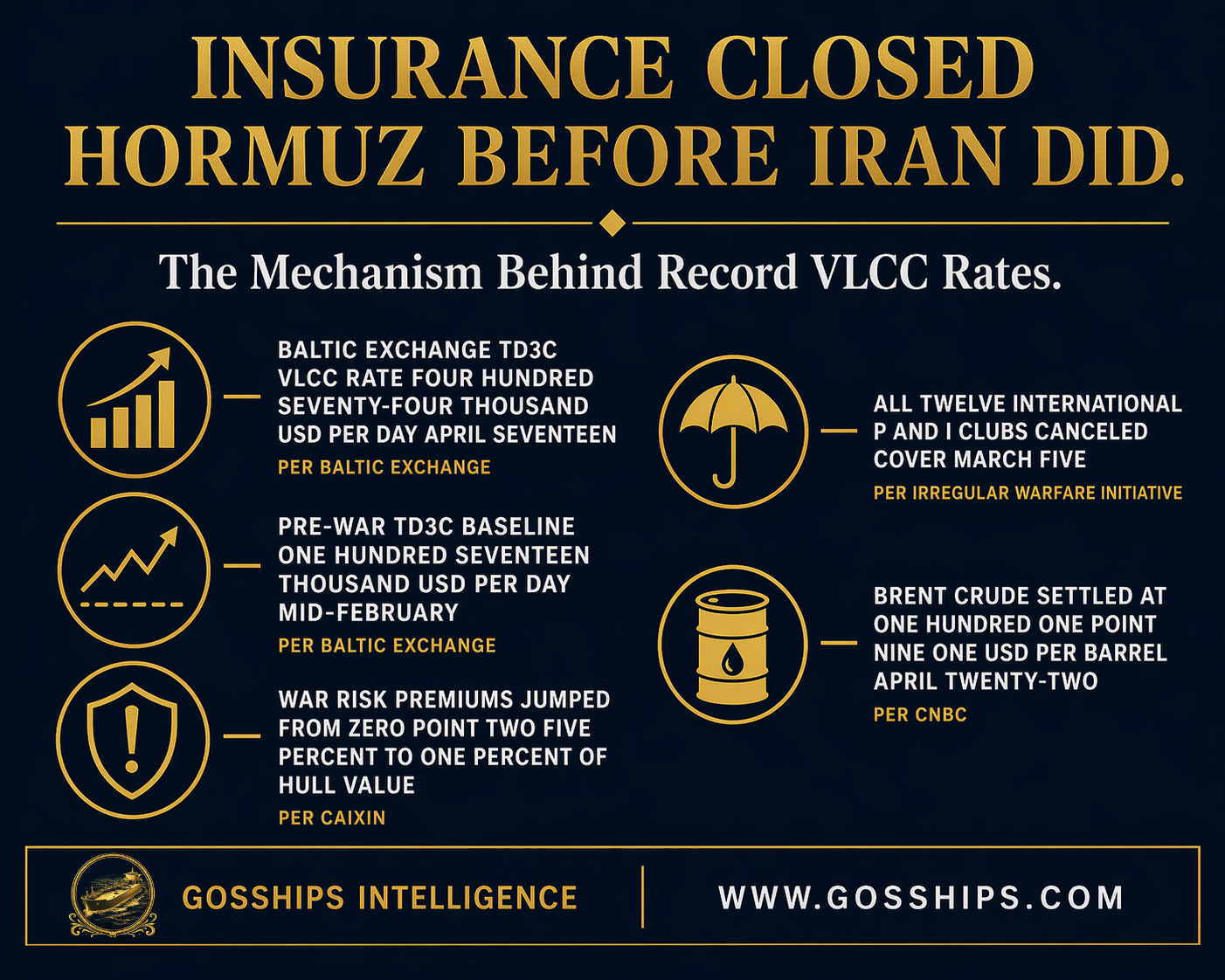 Per the Baltic Exchange weekly report dated April 17, 2026, the TD3C Middle East Gulf to China VLCC rate is almost $474,000 per day, four times the pre-war level of $117,360 recorded mid-February. Per Caixin Global, daily charter rates reached nearly $800,000 within the first week of the war that began February 28, with one VLCC fixture at $770,000 per day. Per S&P Global, all 12 International Group P&I Clubs, covering 90 percent of world ocean tonnage, gave 72-hour cancellation notices for war cover (effective March 5 per the Irregular Warfare Initiative). Per Caixin, war risk premiums jumped from 0.25 percent to 1 percent of hull value. Per Gosships analysis, the insurance market closed the strait before any IRGC attack. The April 22 IRGC seizures compounded an already-closed market.
