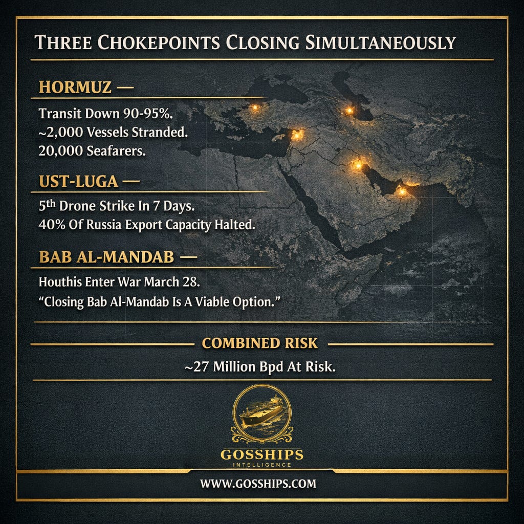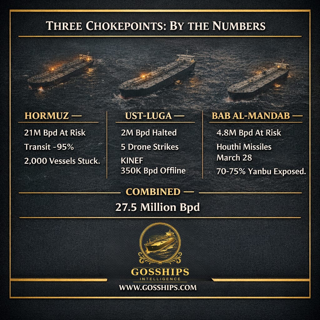 Hormuz, Ust-Luga, and Bab al-Mandab under simultaneous pressure. The world has no backup plan for all three.